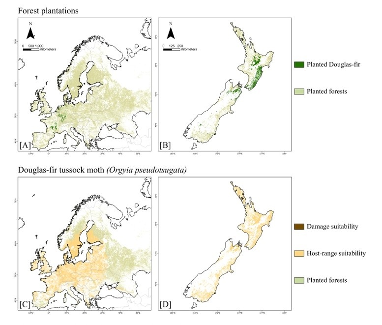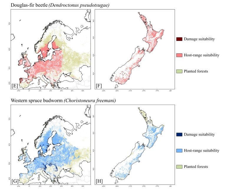 Even if these pests were introduced, most Douglas-fir plantations in Europe and New Zealand are unlikely to experience damaging outbreaks under current climate conditions.