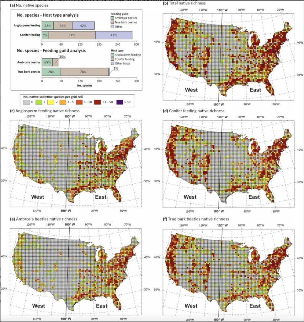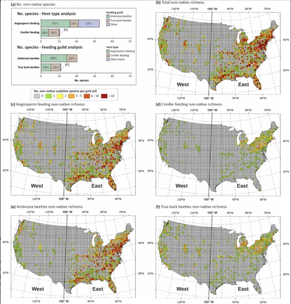 In their article, the authors focus on bark and ambrosia beetles (Scolytinae and Platypodinae) – a group that includes many economically and ecologically important invasive forest pests. Using a unique, large-scale dataset covering the entire conterminous United States, the team analysed patterns of both native and non-native beetle species richness in relation to tree diversity, native insect diversity, climate and socio-economic factors.